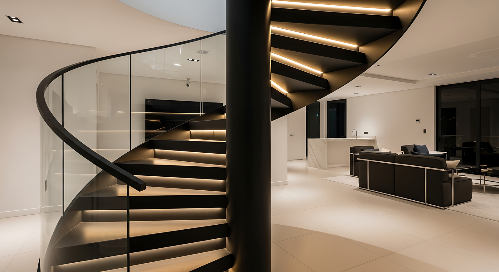- LED strip tersembunyi yang mengikuti kontur tangga melingkar untuk efek visual yang dramatis