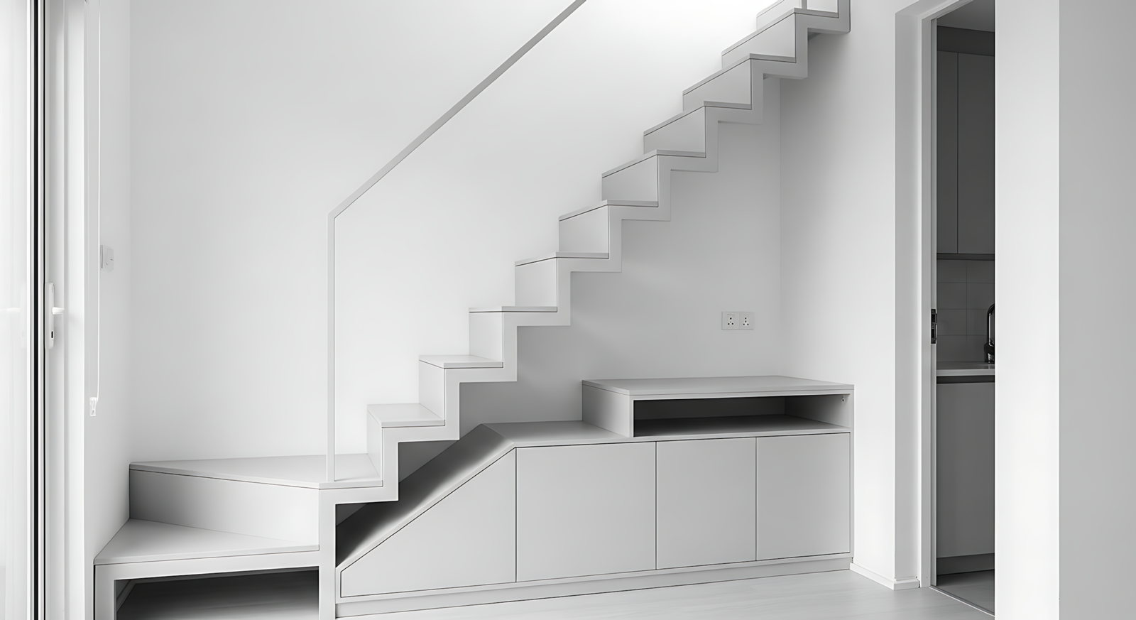 Kami kombinasikan efisiensi ruang ekstrem dengan desain yang mempertimbangkan kenyamanan penggunaan sehari-hari. Hasilnya: tangga yang tidak hanya menghemat ruang horizontal berharga di hunian kecil Anda, tapi juga benar-benar nyaman dan aman untuk semua usia—tanpa kompromi pada keamanan atau kepraktisan.